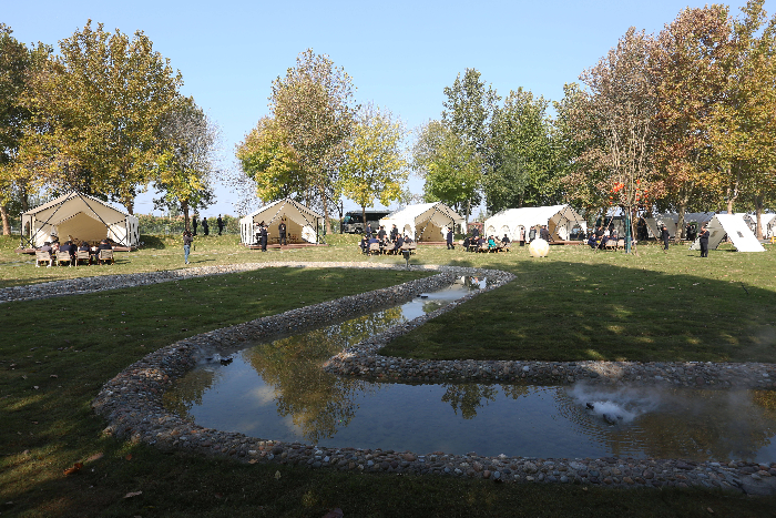 10月29日,市民游客在滨州市滨城区黄河小街湾风景区内的星空露营区小憩。