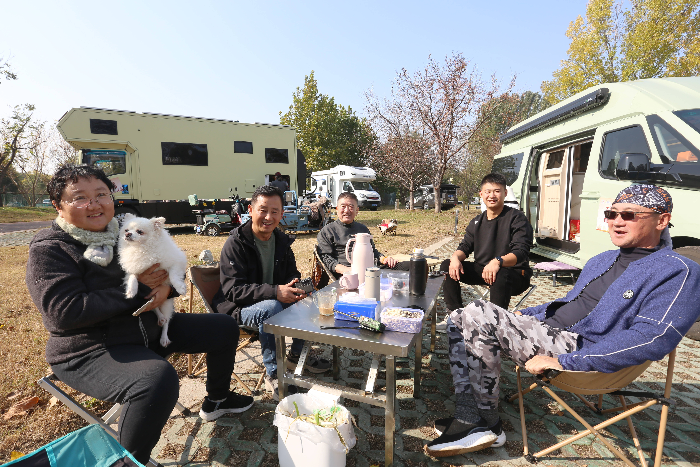在滨州市滨城区黄河小街湾风景区内的星空露营区,众多市民游客驻足小憩,或围桌品茗,或散步赏秋。而在500米之外的房车营地区,来自京、津、鄂、冀、鲁等牌照房车依序停放,车前游客撑起桌椅,或打牌,或遛狗,别有一番乐趣。