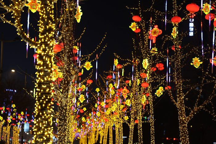 本次工程打造了多个新春网红打卡点,让市民沉浸式感受节日乐趣。其中,中海公园南门的“幸福门”融合剪纸艺术与光影效果,氛围感十足;中海天地桥的大型中国福灯笼,将浓浓年味洒满河畔;在新滨公园,黄河八路、渤海十八路转角等重点节点,“百骏迎春”“时光隧道”“水母树”等创意灯组错落分布,“三十六计”“步步生花”等互动投影光影交错、趣味盎然,为市民提供了丰富的互动体验与拍照打卡场景,让大人、孩子都能在光影间感受新春的快乐。